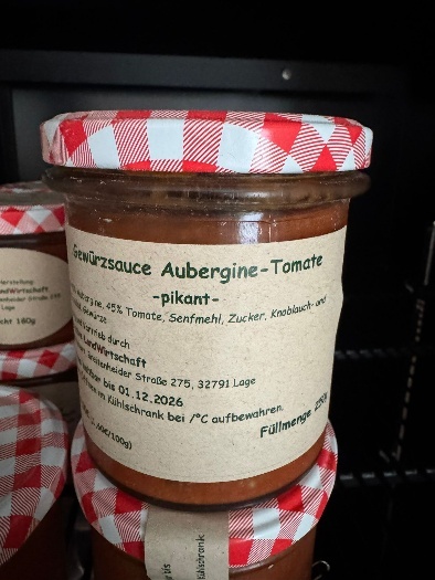 Zutaten: 40% Aubergine, 45% Tomate, Senfmehl, Zucker, Knoblauch- und Zwiebelgranulat, Gewürze