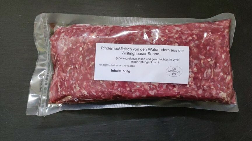 Hackfleisch von Hochlandrindern. Geboren, aufgewachsen und geschlachtet in der Wistinghauser Senne.