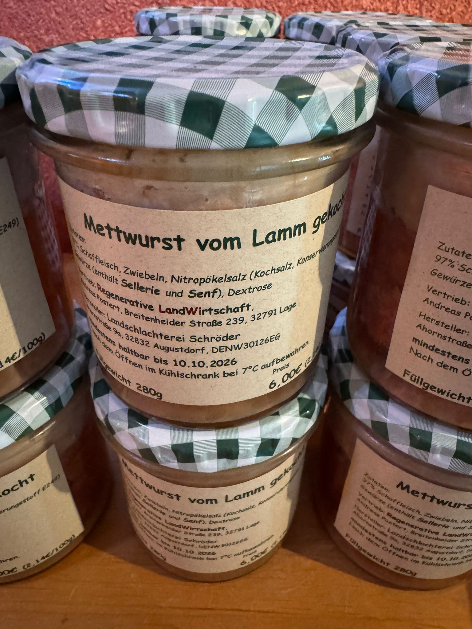 97% Schaffleisch, Zwiebeln, Nitropökelsalz (Kochsalz, Konservierungsstoff E249) Gewürze (enthält Sellerie und Senf), Dextrose