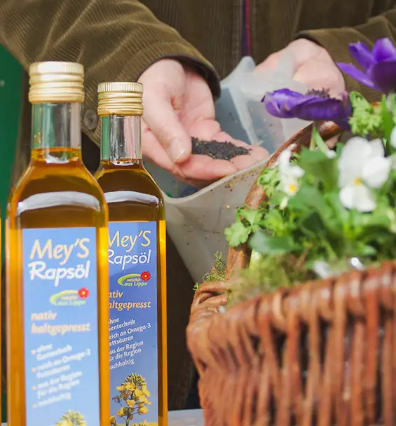 Mey’S Rapsöl ist ein natives Öl von hoher Güte, das ohne Verwendung von Zusatzstoffen in kleinen Hof-Mühlen für den regionalen Markt erzeugt wird. Durch die besonders schonende Kaltpressung bleiben typische Aroma-, Farb- und sekundäre Pflanzenstiffe (Karorinoide) sowie Vitamine weitgehend erhalten.